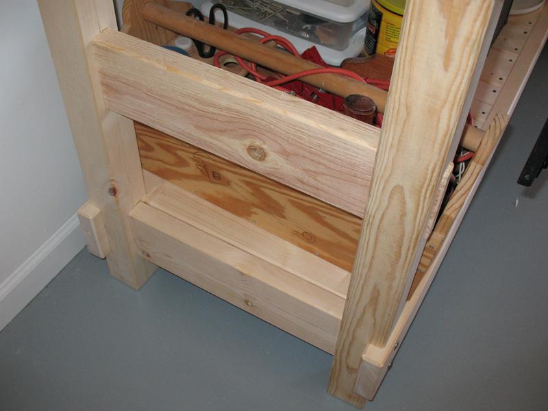 After years of higher priority projects (i.e., procrastination), I finally built a workbench for the garage. Linda got me going with an offer to buy me the lumber as a Christmas present. I decided on the plank-top workbench featured in ShopNotes magazine, Issue 75, May/June 2004. This turned out to be an exceptionally sturdy workbench for only about $100 in materials.