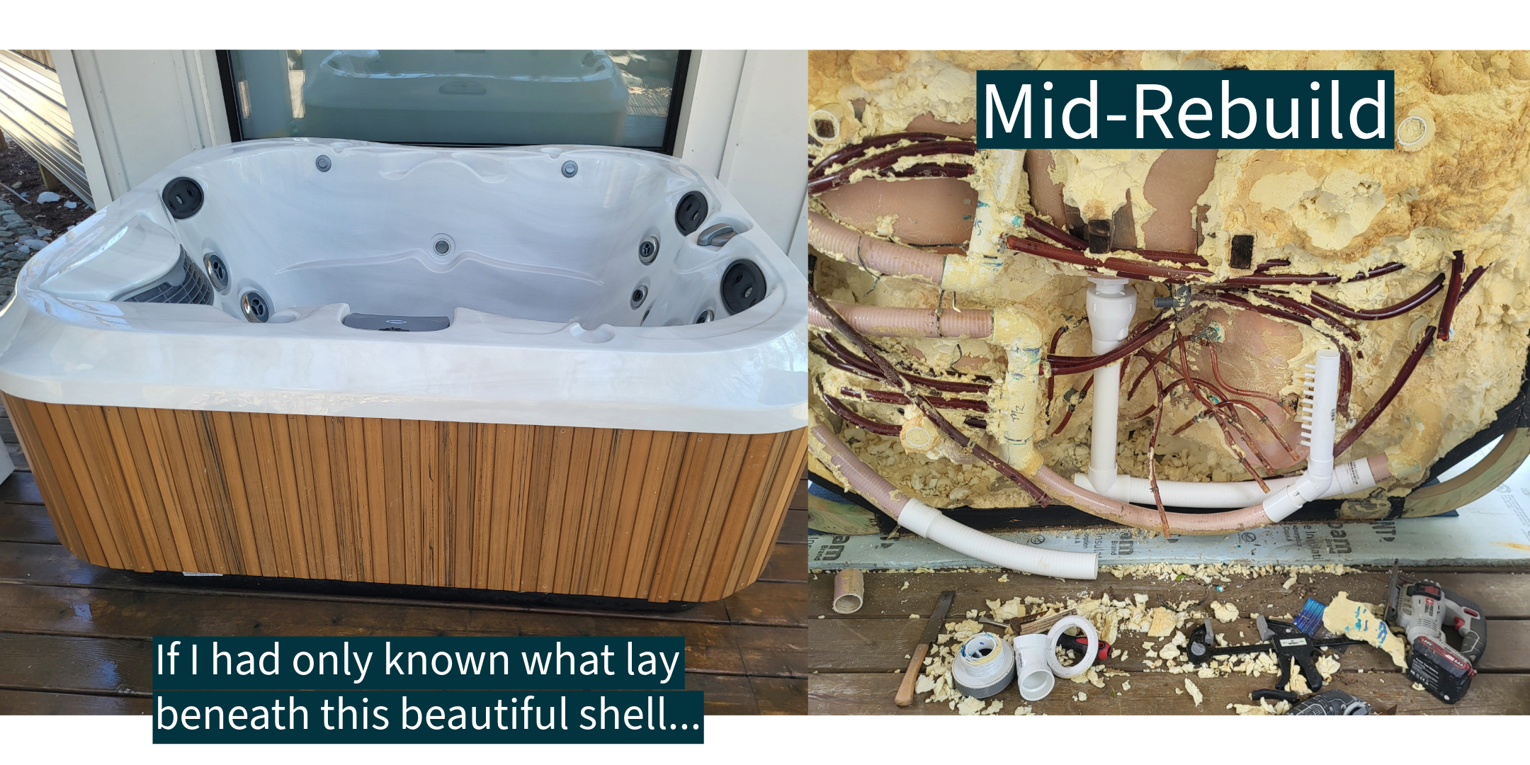 6. I got a 2015 j315 from a senile man for free. The senile man told me the tub was in perfect working order and just needed to have the heater re-attached. I re-attached and filled it and it drained as fast as I could fill it. I suspect there’s a hint of a craftiness in his senility, but I’m choosing to imagine it’s just a sweet old man who forgot his tub was toast. All of the PVC had exploded, nothing worked. But since I paid $600 to have it moved to my house, I was well on my way to the sunk cost fallacy.